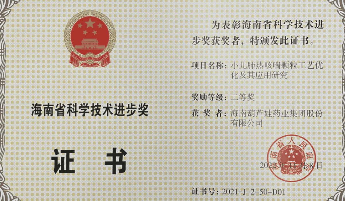 hjc888黄金城·(中国)官网申报的专利“克咳片及其制备方法”荣获 第四届海南省专利奖金奖